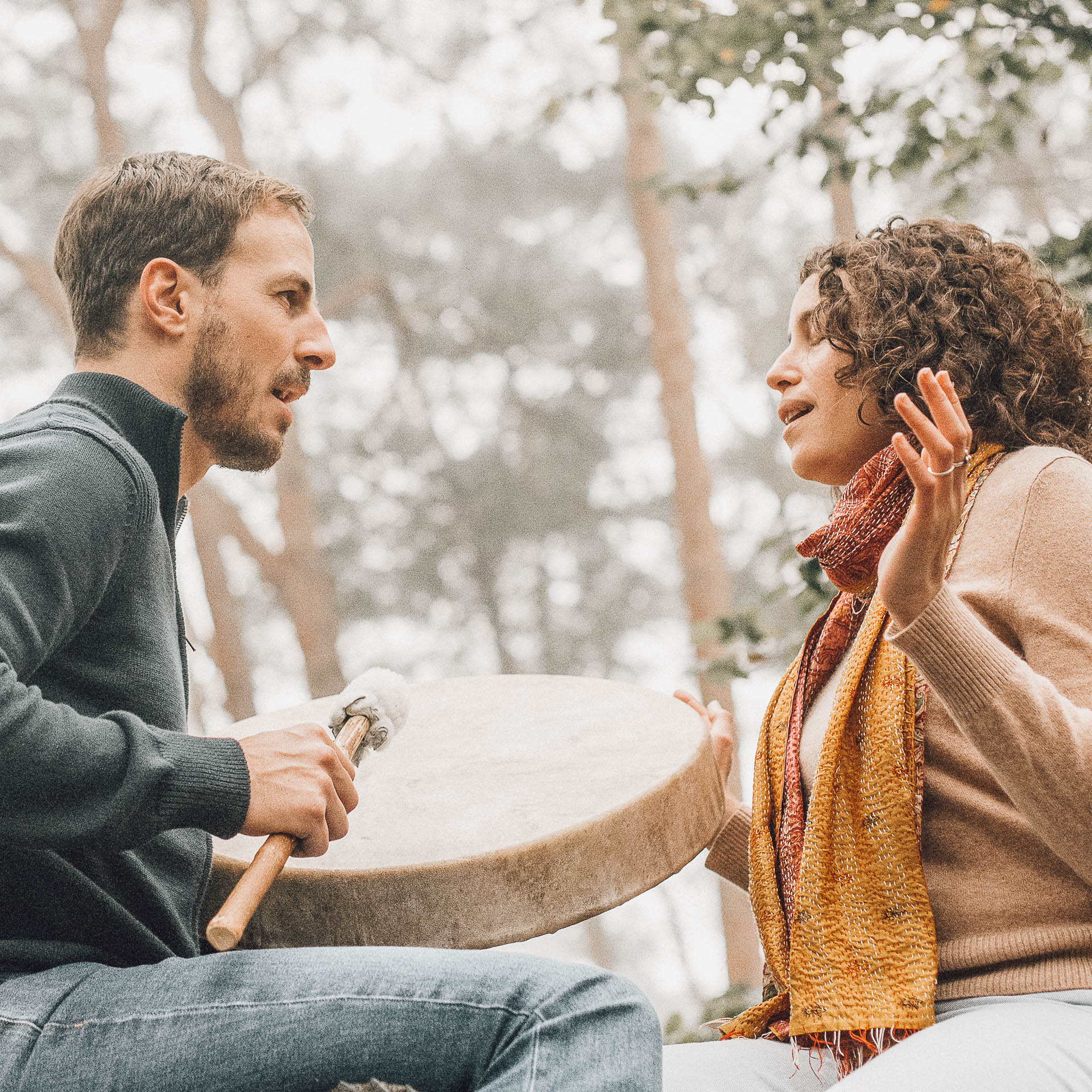 On ne vise pas la performance : on explore la voix spontanée (humming, voyelles, sons rythmiques). Le tambour vous libère de la “note juste”.